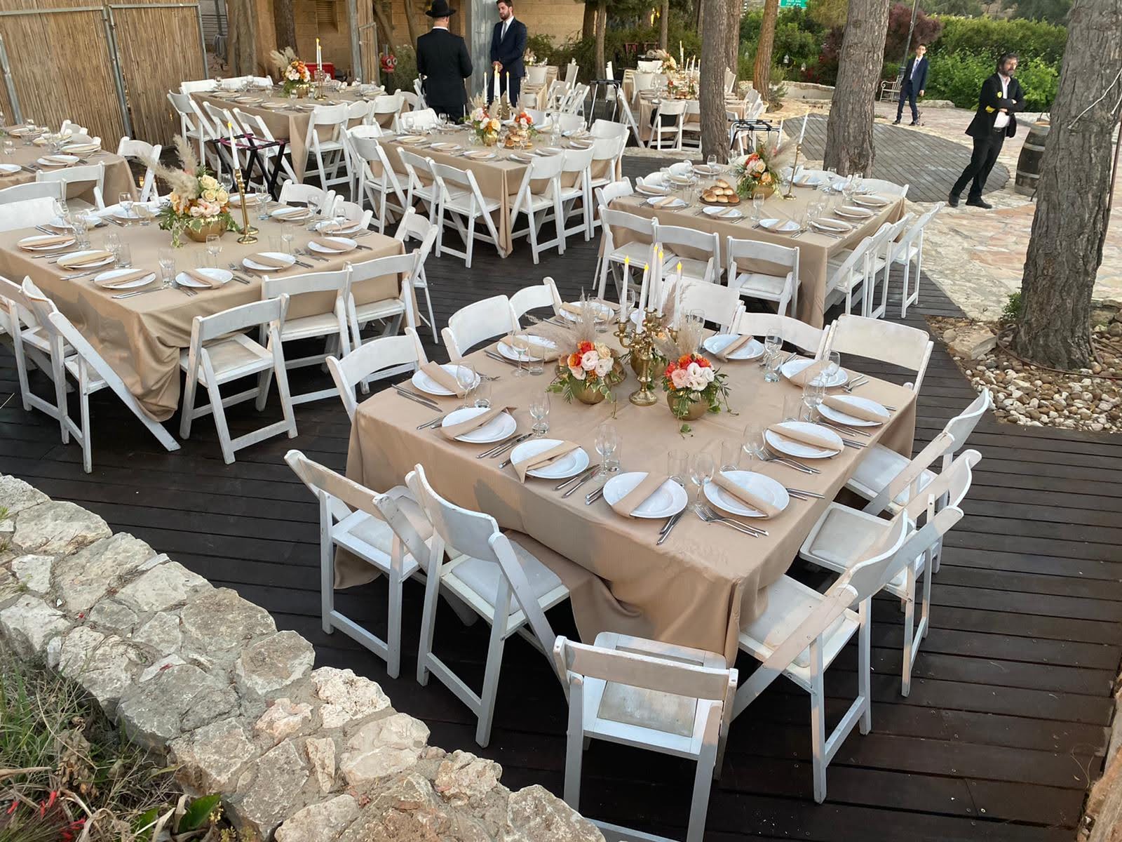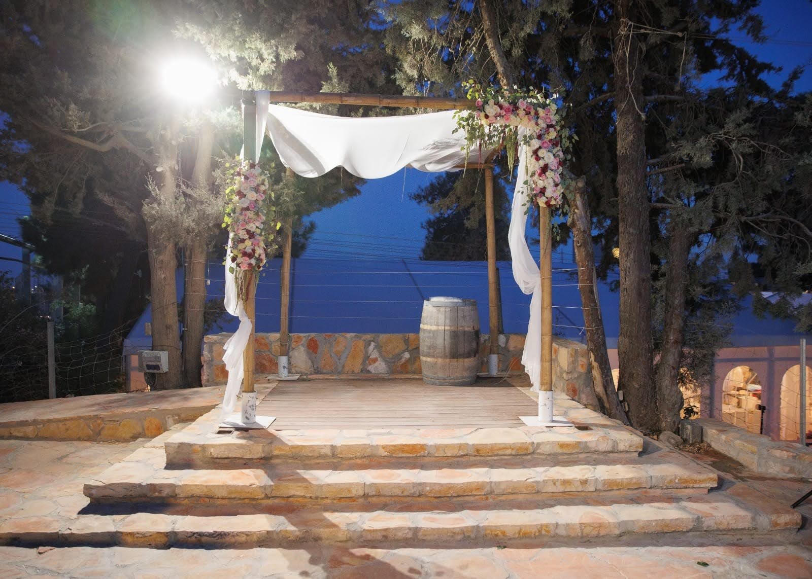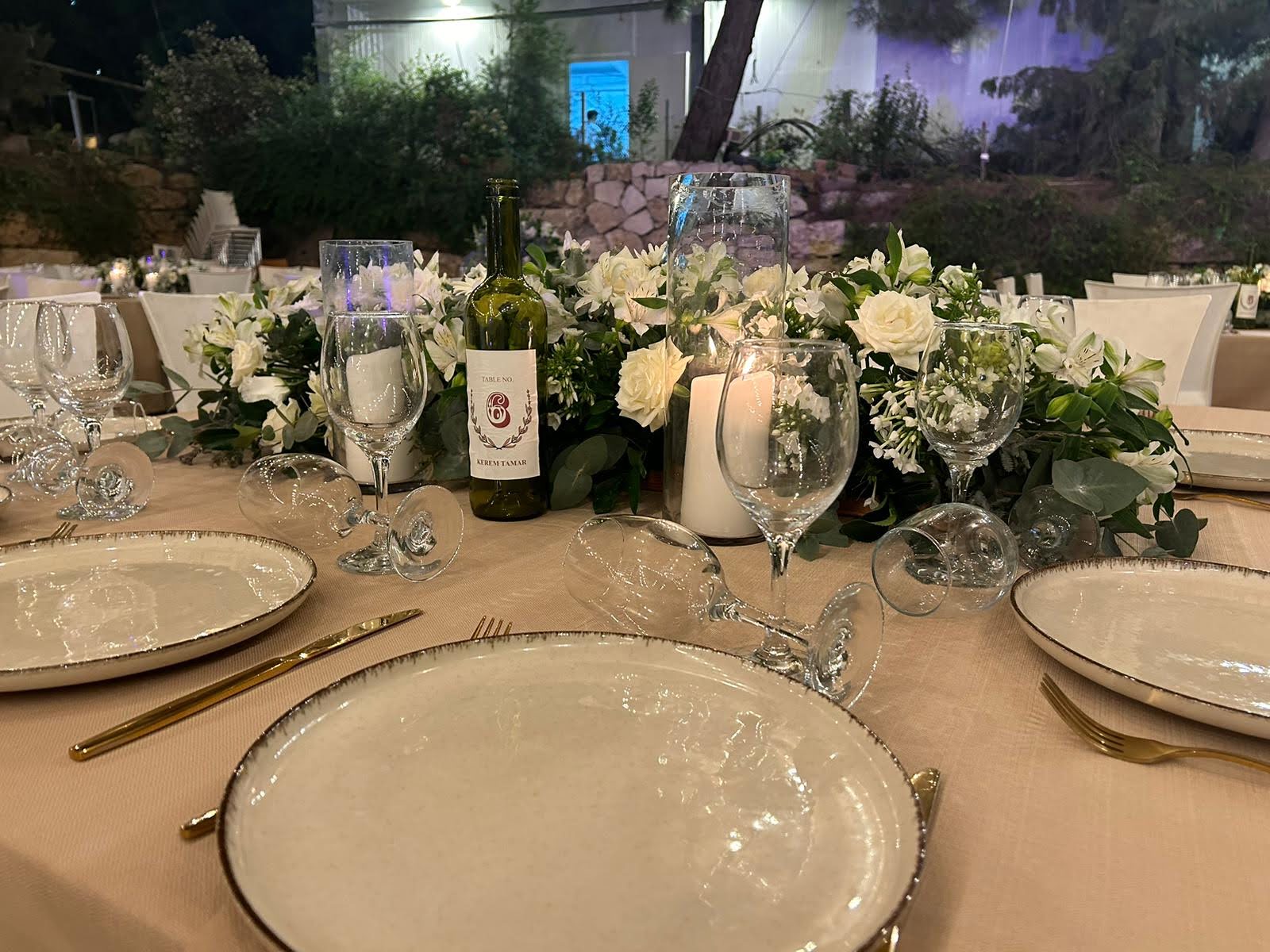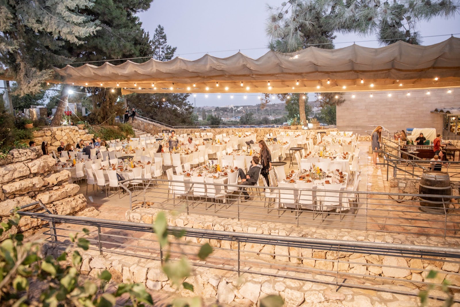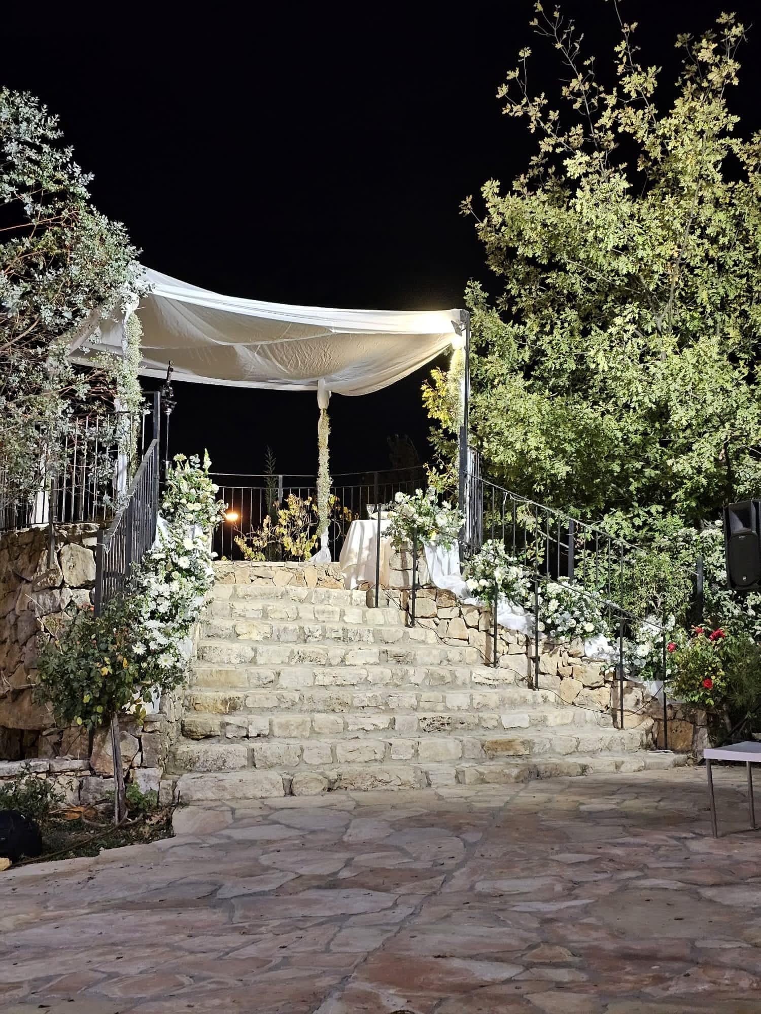 The Tamar Garden offers a different touch to your event with the ambience and mystique of a boutique winery. The venue is next to the Gush Etzion Winery, with many elements of the rich and glorious history of winemaking in the area. There is an ancient winepress in the garden. The chupah is positioned on a reconstructed shomera building (a building that was used in ancient times to store the grapes during harvest season.) The stone tower overlooks the sunset and the luxuriant green vineyards.